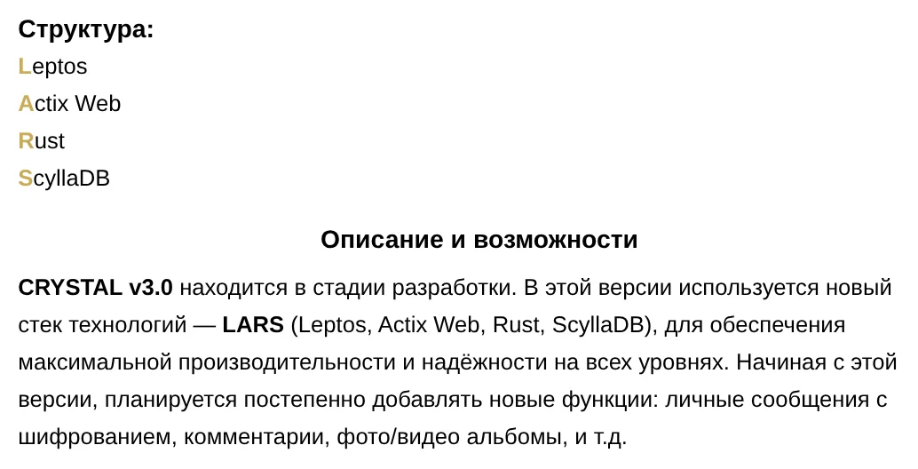 Содержание: 1. Архитектура и структура проекта 2. Описание и возможности Архитектура: SPA, REST API, FSD. Структура: Leptos Actix Web Rust ScyllaDB Описание и возможности CRYSTAL v3.0 находится в стадии...